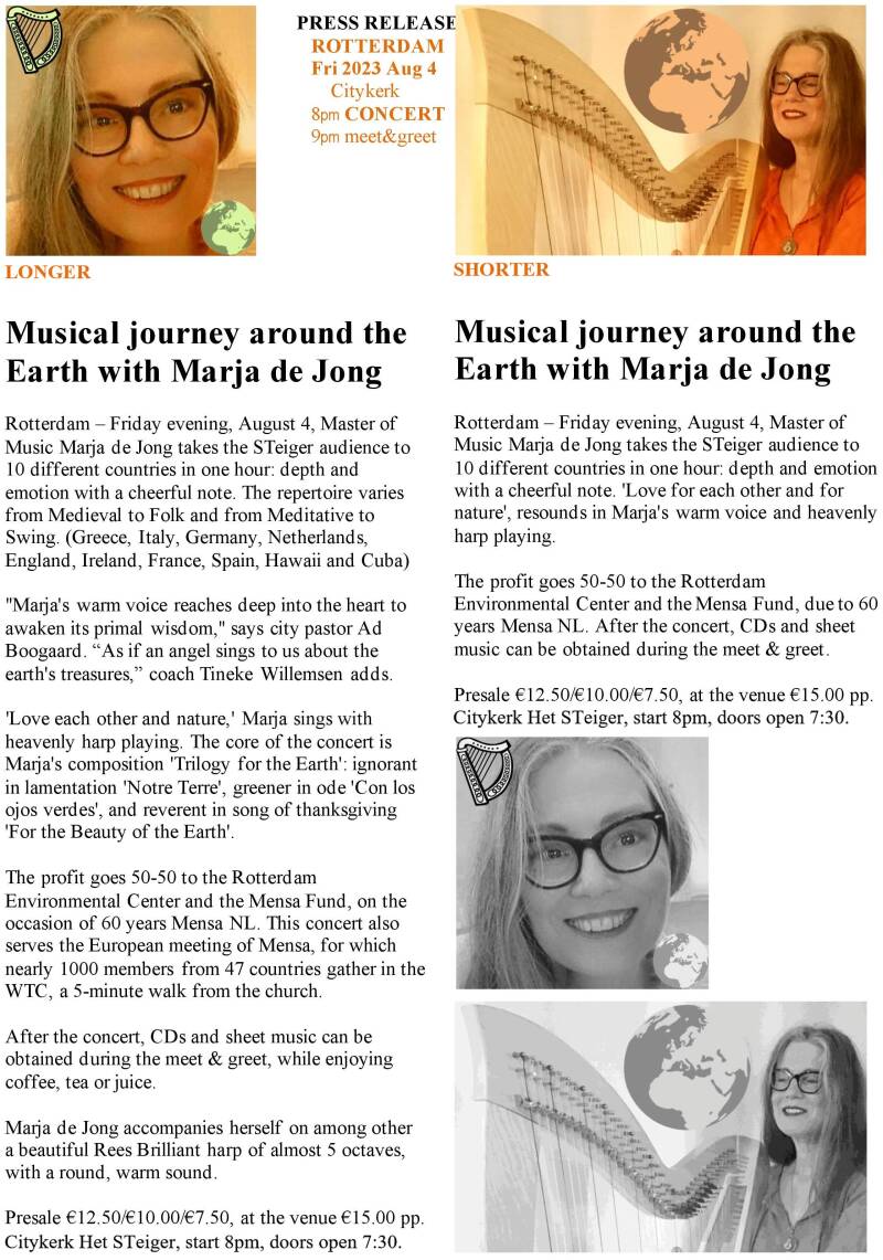 Rotterdam – Friday evening, August 4, Master of Music Marja de Jong takes the STeiger audience to 10 different countries in one hour: depth and emotion with a cheerful note. 'Love for each other and for nature', resounds in Marja’s warm voice and heavenly harp playing.