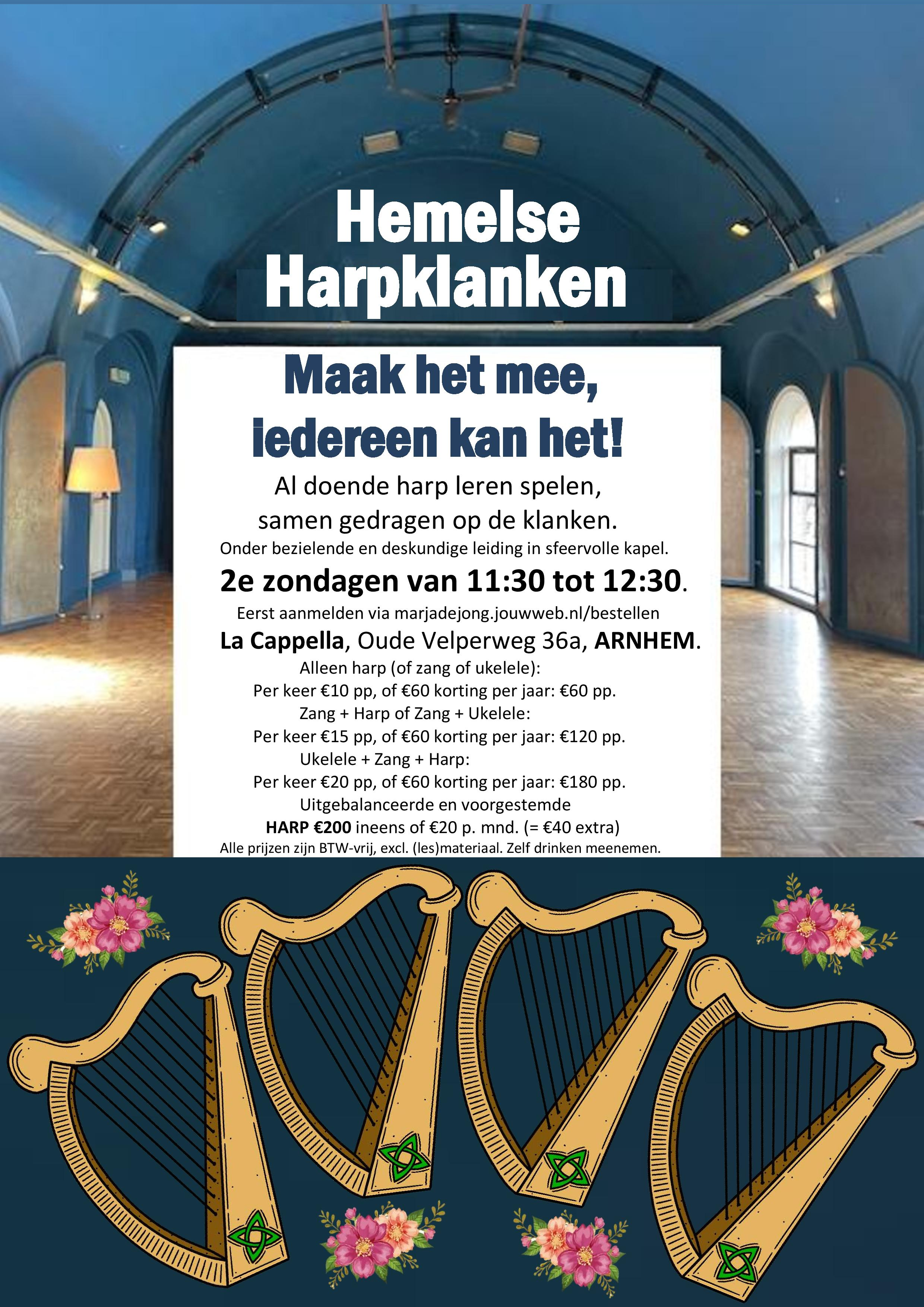 Leer harp spelen in één 4-urige workshop. Datum en tijd i.o.m. cursisten. info+aanmelden.