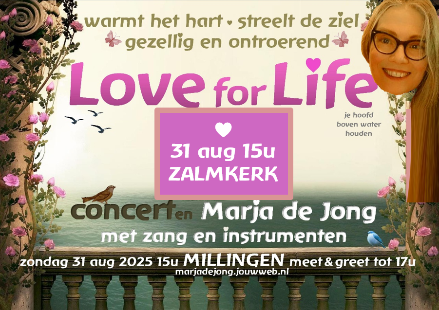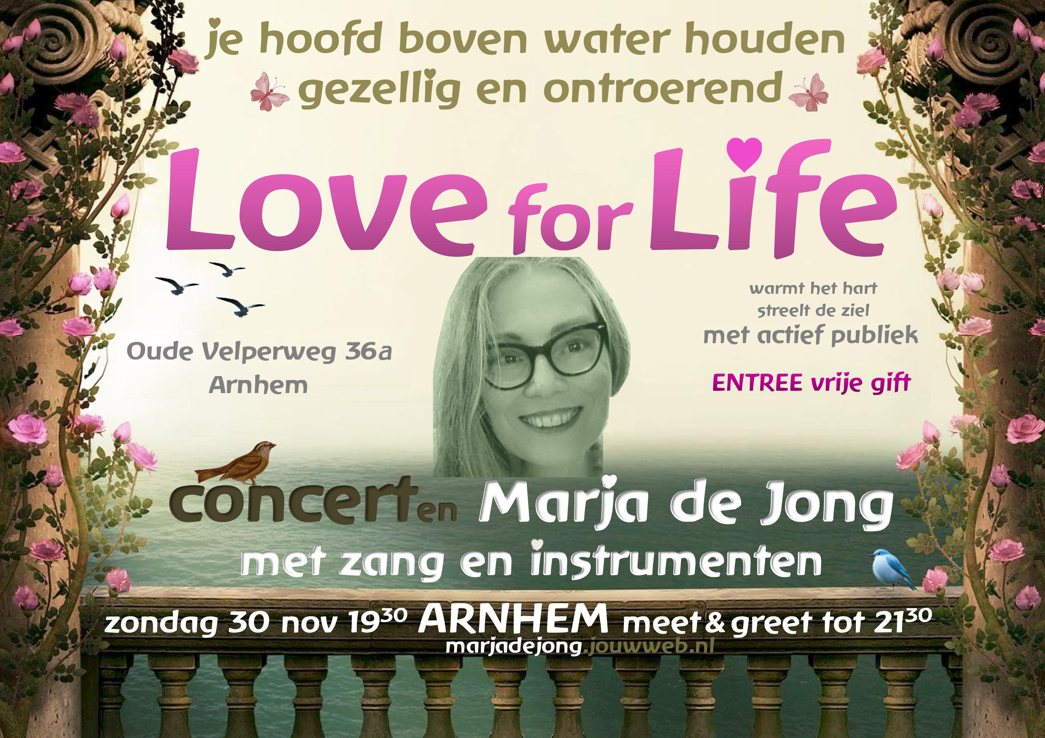 Concert Love for Life 15-16 uur: lichtvoetig en diep, met actief publiek; gezellig napraten tijdens de meet & greet bij de tafel met cd's/ bladmuziek.