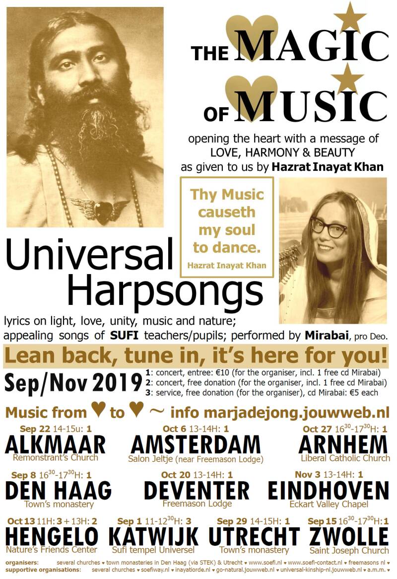 2019 1. September bis 3. November, jeden Sonntagnachmittag ein Konzert mit neuer CD: Musik von Herz zu Herz. Ansprechende Musik und inspirierende Worte, die unser Herz mehr öffnen und uns helfen, weiser zu wählen. Begleitet von raffinierten Harfenklängen berührt Sie die warme Stimme von Marja de Jong in Ihre Seele.