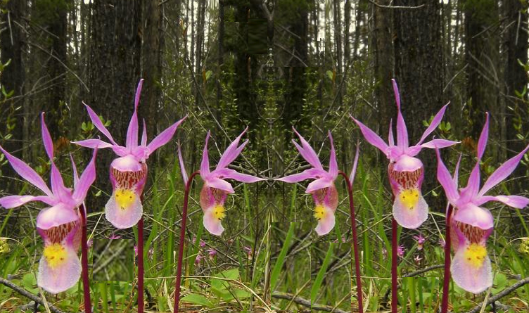 24. Ode to the Fairy Slippers (suggesting the fairies dancing, and advocating the increasingly rare Fairy Slipper orchid species: Calypso bulbosa, the only species in its genus. It thrives in cool coniferous forests or bogs and requires specific mycorrhizal fungi to survive. It is considered threatened in many areas.