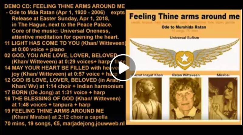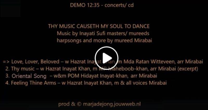0:00 Con los ojos verdes (w+m: Marja de Jong); 0:40 Chalomot ne'imim (w+m: Marja de Jong); 0:59 Lieve Mens (w+m: Marja de Jong); 1:40 Evening with Roses (Israeli Folk); 2:28 Jiddish Riddle Song (Jiddish Folk); 3:04 Die Leierfrau (Schubert/ Müller/ De Jong); 3:35 Ce chant dans mon coeur (French Folk); 4:04 Delight us with your company (Irish Folk); 4:17 Oriental Song (w+m POM Hidayat Inayat Khan); 4:30 Hava nagila improvisation (Israeli Folk); 4:52 Love, Lover, Beloved (w+m Hazrat Inayat Khan/ Mda Ratan Witteveen); 5:13 Thy Music causeth my soul to dance (w+m Hazrat Inayat Khan/ Pyaromir Maheboob Khan); 5:20 Poquito (Cuban Folk); 6:03 Language of Roses (w+m Tallis); 6:24 On Marja de Jong.